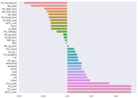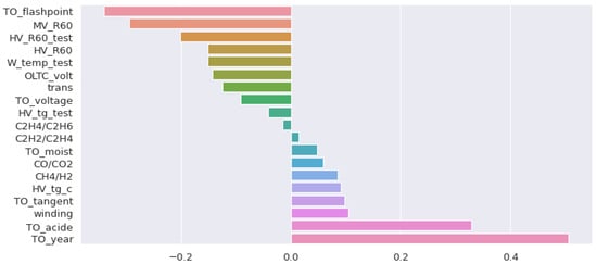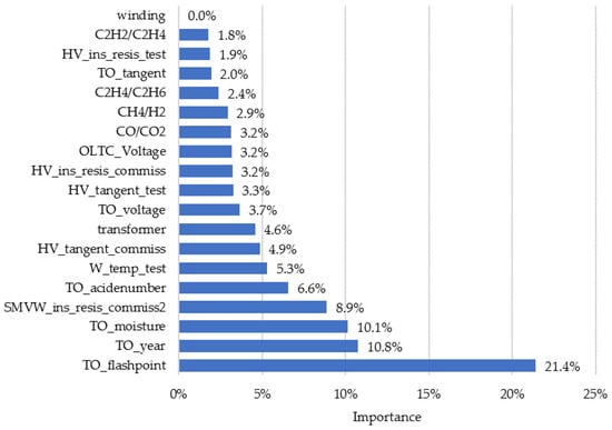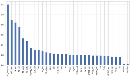 The results of the feature importance assessment for the created model are shown in Figure 16. It can be concluded that for highly accurate power transformer technical state recognition, it is necessary to use heterogeneous features: power transformer oil parameters and its diagnostics, chromatographic analysis, winding parameters, etc.