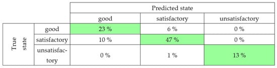 Figure 17 demonstrates the confusion matrix of the two-step classifier performance on the testing set. The rows indicate the actual class, whereas the columns indicate the predicted class, corresponding to the classifier output. There are critical errors when a power transformer in an “unsatisfactory” state is classified as a “satisfactory” one. However, for the considered data sample, the probability of such an error is 1% relative to the total number of samples and 10% relative to faulty transformers. The most common error is to classify a “satisfactory” transformer as a “good” one.