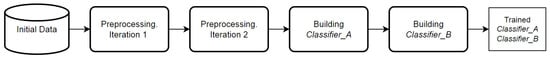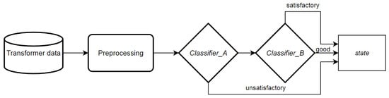 The model creation pipeline consists of the stages of the entire dataset preprocessing and building a classifier (Figure 18). The classification model application pipeline consists of applying transformations to the power transformers’ features and applying the two-step classifier (Figure 19).