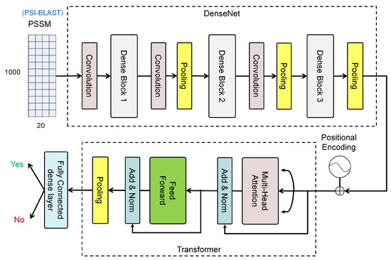During the years, dense convolutional network (DenseNet) has been successfully applied in various fields to improve accuracy and efficiency [14]. It has been verified that DenseNet is able to solve the problem of vanishing gradient and reinforce the propagation of features across networks when compared with a traditional CNN [15]. Additionally, recent research on Transformer architecture [16] has shown that it can focus more on solving the large-scale computing problems caused by the excessive length of the sequence and has surpassed CNNs in many tasks [17]. In this paper, we propose a DL-framework, named DenSec, to predict CSF secreted proteins based on protein sequence information. DenSec employs DenseNet as feature extractor and Transformer architecture with fully connected dense layer as a classifier. DenSec has demonstrated promising performances with high accuracies and outperformed existing state-of-the-art methods.