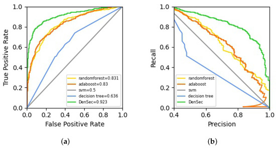 The ROC and Precision-Recall curves for CSF protein prediction differentiation of DenSec versus other machine learning models: (a) the ROCs on the testing dataset; (b) the Precision-Recall curves on the testing dataset.