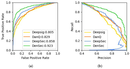 Then, to ensure a comprehensive and systematic comparison, we also compare our model with the existing DL architectures, which include DeepSig (using CNN to detect signal peptides in proteins) [25], DanQ (using CNN with BLSTM to predict the characteristics and functions of DNA sequences) [26] and DeepSec (using CNN with BGRU to predict secretory proteins in 12 types of body fluids) [7]. As shown in Table 3, it can be seen that the performance of the DenSec classifier is better than that of the other DL methods in terms of accuracy, sensitivity, specificity, MCC and AUC. The average ROCs and the Precision-Recall curves are plotted in Figure 3a,b, respectively. Compared with traditional DL-based methods, DenseNet with Transformer is able to accurately predict the secreted protein just using the sequence information.
