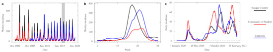 Empirical time series of the influenza and SARS-CoV-2 epidemics. (a) Examples of historical time series of flu over 20 years in three Spanish regions: Basque Country (black), Community of Madrid (red), and Catalonia (blue). Data from each year (spanning from week 40 of a given year to week 20 of the next year) have been concatenated omitting the warm season (during which incidence is negligible). The gray area is expanded in (b) to show the yearly exponential raise, peak, and fall that characterizes the influenza cycle. Here, is data from 2015/16. (c) Evolution of the SARS-CoV-2 pandemics in the same three regions shows the pattern of waves within a single year, which are not always in phases across regions.