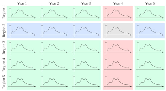 Illustration of different data pools for EDM. In grey, the example we want to forecast, is the testing series. In blue, is the method we call classic, which uses as library of patterns all the examples of the same region. In pink, is the method annual, which uses as library all the examples from the same year. In green, is the method pool, where we use the biggest library, taking all the series that are not from the same region or the same year.