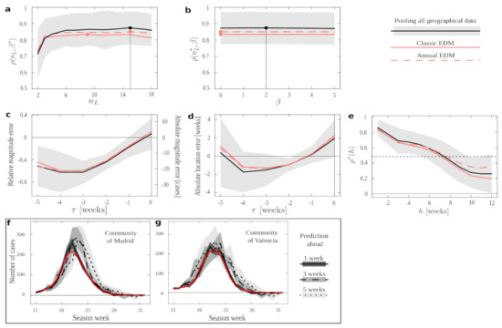 Finally, it is relevant to establish for how long a forecast remains informative. Figure 3e shows the EDM performance, , as it tries to predict h time units ahead in time. Correlation remains above for predictions up to 7 weeks ahead of the available data, with pool being the preferred protocol in most cases. (Protocol annual becomes better around the time that correlation drops below .) We show examples of how a relatively worse (Figure 3f) and better (Figure 3g) forecast degrade as we elaborate estimates with more time in advance. We see how this forecast degrades rapidly for a specific season of the Autonomous Community of Madrid, while it remains quite stable for some other seasons in the Community of València. This, together with the large deviations around most of the measures reported in Figure 3 (gray shadings), suggests that the right protocol might depend on the region studied, and that we might rather address this in a case by case basis. Below, we make some efforts to gain some insight about this issue.