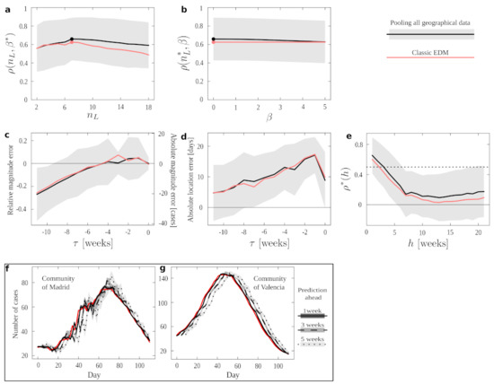 Looking at these plots with greater detail, we see how errors become smaller as we get closer to the actual peak—as might be expected (however, observe the case for COVID-19). The smallest average error in magnitude happens as the data up to the very time of the peak is considered (), while location is better predicted a week before the peak happens (). Error changes signs from negative to positive, meaning that EDM progresses (in average) from underestimating to overestimating. The forecast at (which is the furthest from the peak that we can study with the available data) is more accurate than some others for peak magnitude and than many others for peak location. This effect is noteworthy for estimating peak location: this forecast degrades notably before becoming better—perhaps because the steepest phase of the exponential dynamics happens somewhere between and . It is noteworthy, though, that this does not impact magnitude estimation as much.