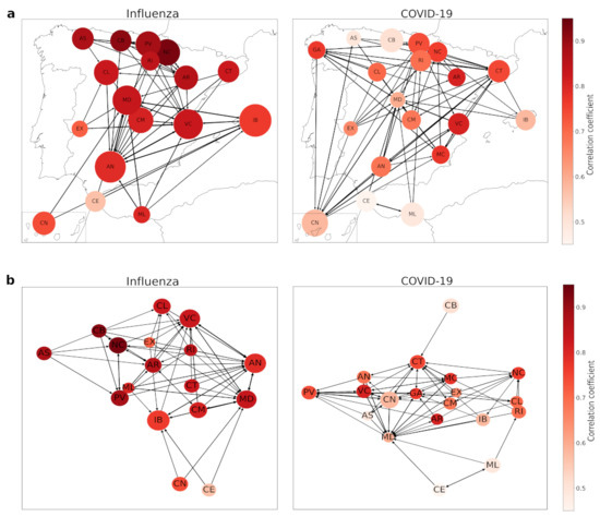 Influenza and COVID-19 networks. The size of the nodes is directly proportional to how many times a certain region has taken an example of itself. The darker a node is, the better it can be described—attending to the correlation coefficient . Connection between generic regions A and B is plotted if the number of examples A takes from B overlaps times the median number of examples A takes from other regions. (a) Geographical representation. (b) Graphical representation.