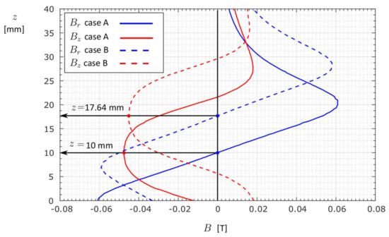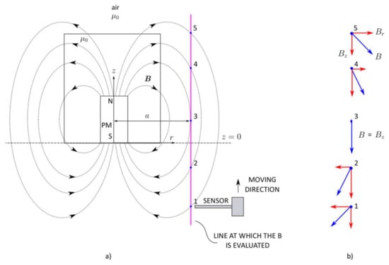 By close examination of Equations (1) and (2) or Figure 3b, it is seen that the radial component of the field vanishes at and the z-component reaches its extreme value there. The magnitudes of the field’s components are illustrated in Figure 3b. The field is evaluated along the line parallel to the -axis at . Referring back to the setup in Figure 1, the PM’s position can be determined by finding the point on the line along the z-coordinate where equals zero and attains its extreme value. While the field orientation in a space depends on the current direction (or the direction of magnetization in the case of a PM), the term extreme mentioned in context with can refer to a minimum or maximum value.