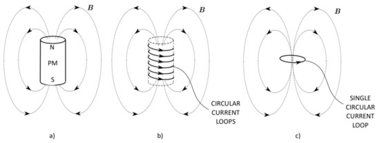 To satisfy the formality, a brief mathematical formulation of the aforementioned physical abstraction is derived in the following section. The magnetic field produced in the space by the PM (Figure 2a) can also be presented as a field evoked by the current loops, as shown in Figure 2b. For simplicity, let us consider a PM model equivalently described only by a single circular steady current loop (Figure 2c). Referring to electromagnetic theory, a magnetic field density around such a structure is defined straightforwardly by Equations (1) and (2) [31].