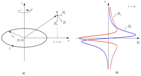 where is the absolute permeability of the free space; is a steady current in the loop; is the radius of the current loop; is a radial distance component; is an axial distance component; is an elliptic integral module defined as ; and are the complete elliptic integrals of the first and the second kind of argument , respectively. The geometry arrangement which pertains to Equations (1) and (2) is provided in Figure 3a.