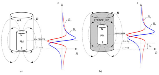 PM and the magnetic field distribution along the container’s wall in the air. (a) The container is filled with the air, and (b) the container is filled with the ferrofluid.