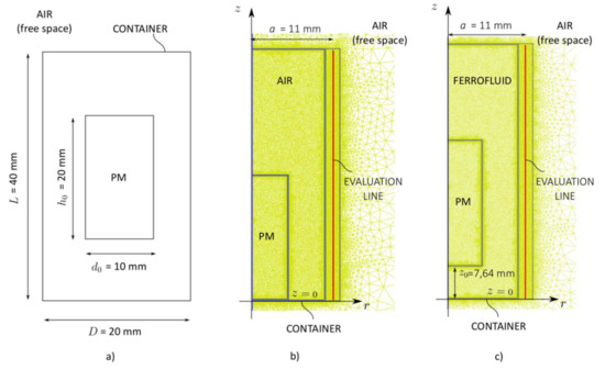The materials’ properties listed in Table 1 were chosen to fit well with the ones in [23,26]. The meanings of the symbols in Table 1 are as follows: is the material or substance density; is the relative permeability; and are the remanence and coercive force of the PM, respectively; and is the initial magnetic susceptibility defined at low magnetic field intensity. While the PM consists of a rare earth hard magnetic material, its slope in the B-H characteristic is very close to unity. Actually, in reality, the value of the PM’s relative permeability is about 1.05, but the unity value is applied in the simulations to agree with the one in [23]. The mesh size within the PM and container was chosen so as to provide an accurate field approximation, especially because the used software, FEMM 4.2, deals only with the first order triangular elements. To obtain a better accuracy, a very fine mesh was used in the space where the evaluation line was placed. The automatic triangle mesh size option was posed in the outer space (free space) outside the container, as is shown in Figure 5b,c. The total number of elements involved with the FEM model was 38,750.
