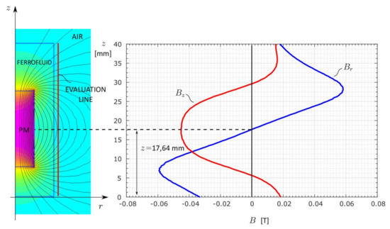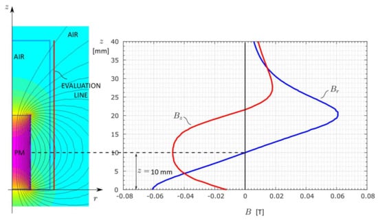 Simulation of the magnetic field distribution in the free space around the PM within the empty container along with the spatial distribution of the field’s components and is given in Figure 6. The field was evaluated along the vertical line 1 mm from the container. The shapes of the curves in the figure apparently corresponded to those predicted by the presented theory. Moreover, from the numerical results, it was evident that the PM center located at coincided with the point on the evaluation line where was equal to zero and reached its extreme value. The field distribution revealed more information. Examining the shape of the radial magnetic field component in Figure 6, one can see that the PM height was almost equal the distance between its extreme values. It should be pointed out that the last condition held only for the field evaluated not too far from the magnet, as will be shown with the parametric analysis at the end of the chapter. However, the aforementioned condition was met in most of the applications of interest.