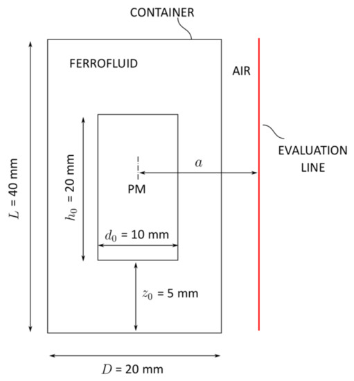 In order to estimate the technical limits of the presented technique, additional parametric analysis was conducted in the FEMM 4.2 environment. The analysis encompassed a variation of the three crucial parameters, the relative permeability of the ferrofluid , the distance from the PM’s center to the sensor and the PM’s height, which all affect the magnitude and dispersion of the field in the air. For convenience, the geometry arrangement shown in Figure 9 was adopted to all cases in the analysis. Despite the fact that the levitation height changed with the magnetic properties of the fluid, the one here was fixed at 5 mm. The goal of the analysis was to appraise the design limits and constraints of the technique.