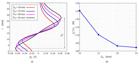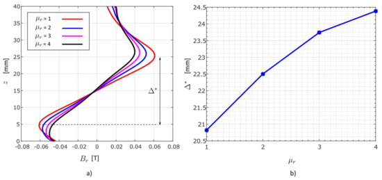 The relative permeability of the ferrofluid was varied in the range from 1 to 4 in the step of 1. For each value of the radial magnetic field component was calculated along the line 1 mm distant from the container’s wall, as shown in Figure 10a. The results show that the increase in magnetic permeability of the fluid diminished the magnetic field’s magnitude in the air. The difference between the extreme values of , on which basis the estimation of the magnet’s height was brought, increased along with , as shown in Figure 10b. The first parameter’s value = 1 corresponded to the magnetic property of the air.