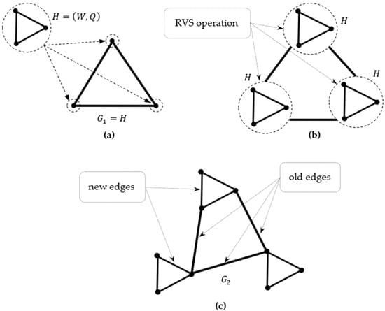 Let us consider a step-by-step process of constructing a prefractal graph and applying the RVS operation. At stage , the vertices and edges in the given seed  are numbered, and the resulting graph is denoted by . At stage , all vertices of  are replaced by the seed , the resulting graph is denoted by . Figure 2 shows the generation  by seed —a complete 3-vertex graph (triangle) with the arbitrary adjacency of «old» edges: (a) the vertices replaced by the seed are circled with small dashed circles; (b) the seeds replacing the vertices are circled by middle dashed circles; (c) the old edges of  are marked with bold lines.