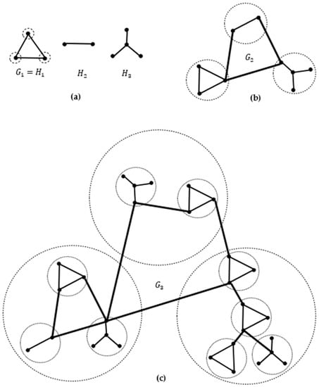 Figure 4 shows  generated by a set  with arbitrarily adjacency of old edges: (a) ,  is a complete 3-vertex graph-triangle,  is a complete 2-vertex graph,  is a 4-vertex graph star; (b) the seeds that again replaced the vertices are outlined by small dashed circles; (c) large dashed circles outline the subgraphs that appeared instead of the graph vertices  after the second stage of replacing the vertices with a seed.