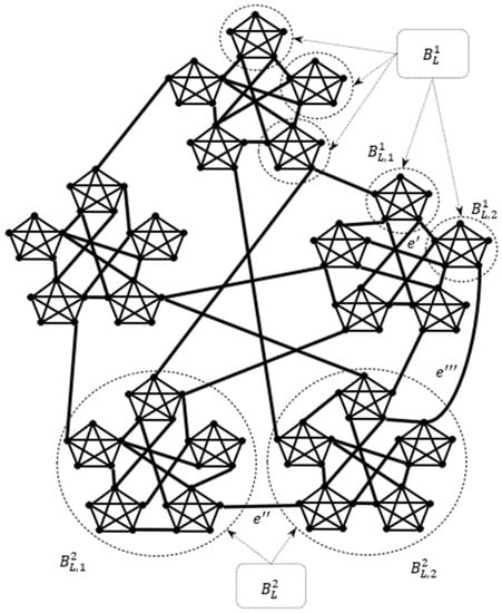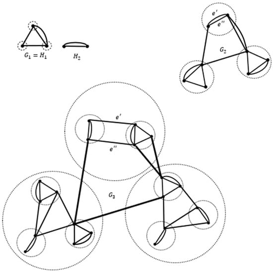 Namely, the old edges of rank  combine the set of subgraph-seeds  into the set of blocks  of the second rank, they, in turn, are combined by the old edges of the rank  into the set of blocks  of the third rank, and so on. Finally, the old edges of the first rank unite the set of blocks  of the rank  into a connected prefractal graph . The process of connecting blocks of different ranks is shown in Figure 10.