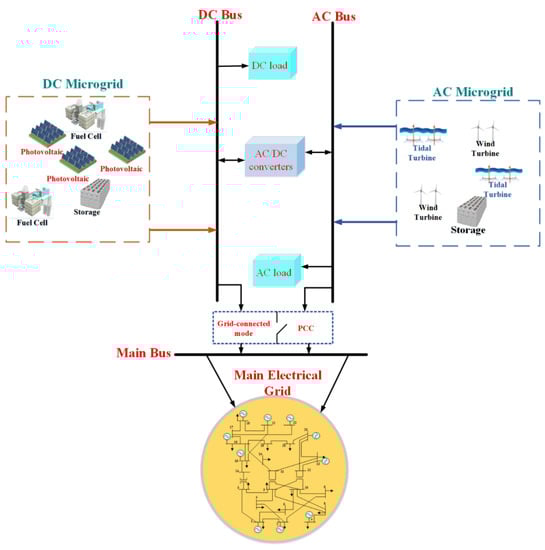 In recent research, microgrids performance has shown that they can help grid energy operation become more controllable and more flexible in critical conditions, namely cascading faults and blackouts [27]. Keeping this in mind, this paper presents an outstanding hybrid energy framework of AC/DC microgrids that aim to reduce grid vulnerability toward targeting from cyber-attackers. The hybrid microgrid is introduced as an efficient solution that employs all AC and DC energy sources in an environmentally friendly energy framework [28]. To aid visualization of the proposed hybrid microgrid, Figure 1 depicts the developed structure, including the photovoltaic units, wind turbine units, tidal turbine units, and hydrogen-based fuel cell resources. In this section, the mathematical framework of the proposed microgrid is presented.