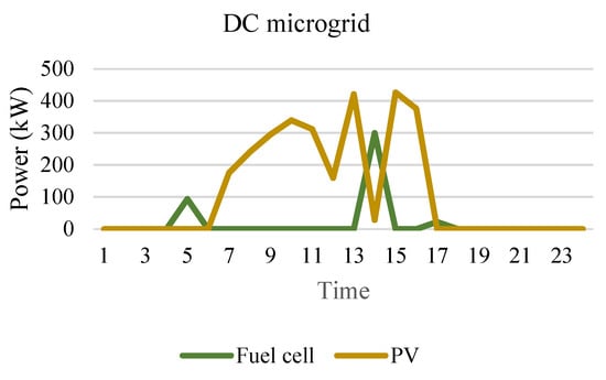 PV units are the other DC resources employed within the DC microgrid. The relationship between the output power and the solar radiation in PV is a well-established fundamental interaction based on (25): as solar radiation increases, so does the power generation in the PV unit. It can be clearly indicated that the generated power calculation may obtain an irregular outcome if PV loss is ignored in the computing process. Also, cooperation between the storage and PV units on supply for common demands can guarantee output power and neutralize fluctuations arising from solar radiation uncertainty. The constraints related to the storage unit are defined in accordance with (26)–(29). Looking at (26), the storage unit’s output power is determined by considering the charging/discharging power and also the power consumed in the fuel cell unit. The energy level of the battery is also checked every hour based on Equation (27). The storage unit is allowed to perform with an emphasis on its charging/discharging power limitations and the permissible energy level, as shown in (28) and (29). Finally, the objective function of the proposed DC microgrid is followed by (30) [29].