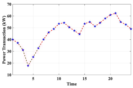 As previously mentioned, this paper aims to follow an efficient hybrid microgrid-based energy framework with help from an unerring vulnerability model to identify and mitigate vulnerable areas in a grid, which can result in cascading faults due to malevolent cyber intrusions. That said, the primary goal is to describe the performance of microgrids and how they exchange energy with the main electrical grid in the context of an environmentally friendly hybrid energy framework. Consequently, the applicability of the proposed framework for improving grid vulnerability indices as much as possible was also examined. Hence, Figure 2 indicates the generated power of the DC sources, including PV and fuel-cell units, in terms of scheduling for power injection into the hybrid bus through the corresponding electronic converters. It is clear that the PV unit received more demand than the others, owing to more solar radiation at those times. The low energy price of the fuel cell unit at t = 14 is mainly due to more power being injected by the fuel cell compared to the PV unit. Further, Figure 3 shows the generated power related to the AC units in the hybrid energy framework. As can be seen, the WT and tidal turbine units generate the needed power at some hours, with an emphasis on energy price and technical limitations such as wind speed and current speed. Having looked at Figure 2 and Figure 3, it can be inferred that the renewable units have no power generation at t = 1–3 and t = 21–23. This means that the microgrid loads are satisfied by the grid-connected link at these hours. To justify this elucidation, Figure 4 depicts the power transaction between the proposed hybrid microgrid and the main electrical grid. The star points in this figure show the accurate amount of power exchanging between the grids. It is necessary to note that the positive power exchange indicates energy being trading from the grid to the hybrid microgrid and vice versa.