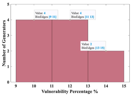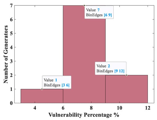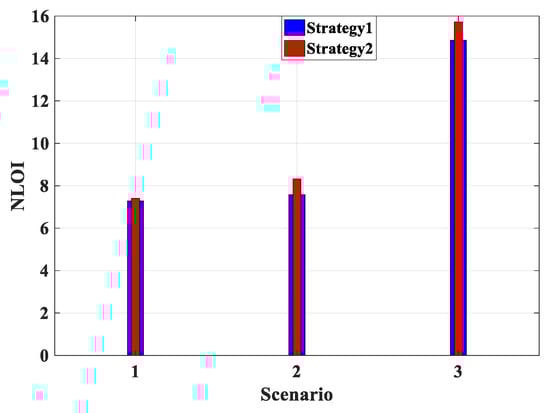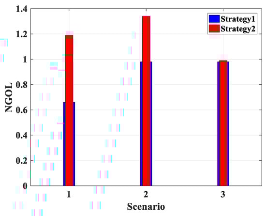 At this point, there was a need to determine whether or not the proposed strategy could influence grid operation towards reducing the effects of contingent events on the performance of the lines and generators to prevent blackouts in the grid. This was accomplished by implementing the vulnerability analysis on the energy management of the grid. The relevant results from this analysis are indicated in Figure 5, Figure 6, Figure 7 and Figure 8. As can be seen, the results are for two strategies: (1) strategy 1 and (2) strategy 2, previously defined. Hence, Figure 5 shows the vulnerability percentage of generators for strategy 2. As can be seen, the vulnerability percentages for the generators are classified by three different ranges, including four generators in the range of 9 to 11, another four generators in the range of 11 to 13, and finally, two generators in the range of 13 to 15. It can be inferred from these results that the vulnerability percentages were obtained based on strategy 1 with max/min ranges of 9 and 15, respectively. Meanwhile, the vulnerability percentages for generators based on strategy 2 took a range of 4 to 12, as shown in Figure 6. This means that the proposed hybrid framework could enable a remarkable reduction of almost 65% in the vulnerability of generators. In this context, Figure 7 and Figure 8 illustrate the vulnerability of lines for both strategies. As can be seen, the vulnerability percentages of all lines based on the proposed hybrid structure decreased in the realm of 25% compared to strategy 2, which also testifies to the proposed model’s effectiveness. In addition, looking at the vulnerability model, it can be inferred that the generation units and the lines have the greatest risk of outage due to the setting of the protective devices. Hence, analyzing the NGOI and NLOI indices in the vulnerability model is significant. By doing so, the comparative results show that the hybrid energy framework leads to a marked slump in the NLOI indices compared to strategy 1 (see Figure 9). Similar to the line outage, comparing the NGOI indices under different scenarios proves the proposed framework’s effectiveness in reducing the generation unit vulnerability of the electrical grid, as indicated in Figure 10. Also, Figure 11 shows the comparative results related to the total cost of the grid for both strategies, which reveal a tendency toward reduction in grid energy cost under the proposed hybrid energy framework.