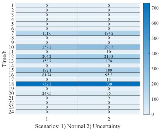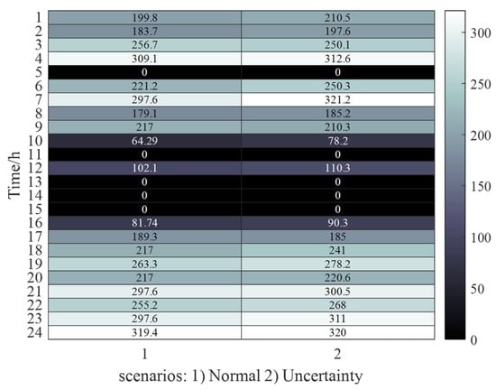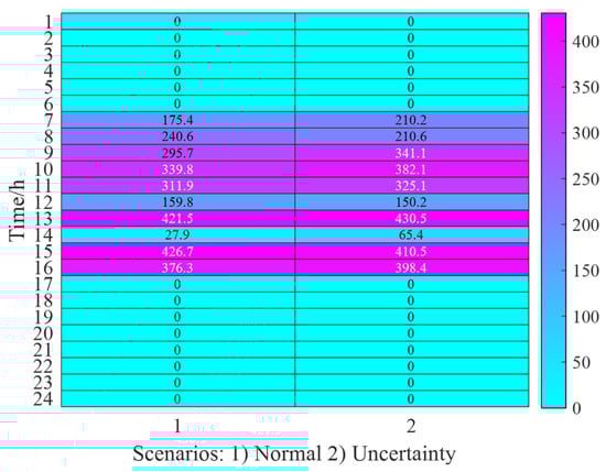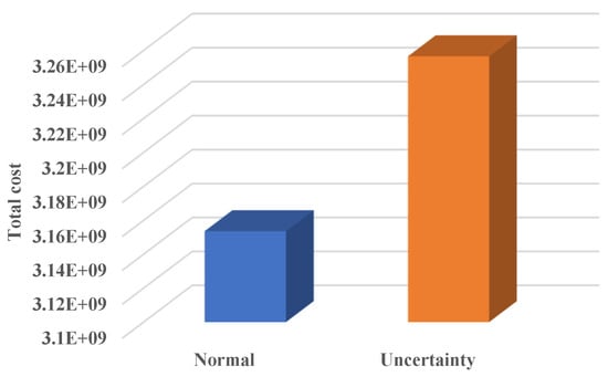 To properly evaluate the proposed hybrid framework, the grid performance must be examined using the uncertainty model due to its effectiveness in finding an accurate solution. The uncertain parameters of the hybrid microgrid include the current speed of the tidal unit, solar radiation, and wind speed, as well as the load demands. It is worth mentioning that the parameters that have remarkable fluctuations (at the SD level) can affect energy scheduling if they are not precisely forecasted via an uncertainty model. In addition, correlation among these uncertain parameters is another issue that needs to be addressed. As already seen, the UT approach would bring accurate forecasting and correlation to the uncertain parameters. Note that information on input data such as those for wind speed, tidal current, and solar radiation can be found in detail in [31]. To model the uncertainty of these parameters, there is a need for their time-continuous mean and variance values, all of which are derived in detail from [31]. It is worth noting here that this study considers a normal distribution function for solar radiation and load demands, while the Weibull distribution function is used for modeling wind speed and tidal current. Hence, we implemented the UT method, considering the wind speed, tidal current, and solar radiation, and provided the output vectors, including the output powers of WT, tidal turbine, and PV, in Figure 12, Figure 13, Figure 14 and Figure 15. We have indicated the outcomes of the uncertainty model for the output power of WT, the output power of the tidal turbine, and the output power of PV based on the normal and uncertainty scenarios in Figure 12, Figure 13 and Figure 14. As can be seen in Figure 12, the wind speed based on the uncertainty model had remarkable changes in the output power at some hours compared to the normal scenario. These changes in the output powers of WT resulted from the uncertainty in the wind speed. Similarly, such alterations can also be seen in the output power of the tidal turbine in a comparison of both scenarios, as shown in Figure 13. Looking at Figure 14, the solar radiation uncertainty model reveals the alteration of the output power of PV systems for most hours. The comparative results of the total cost under the normal and stochastic statuses are indicated in Figure 15. It can be seen that uncertainty-based energy scheduling could create a high fluctuation of almost 3.36% in the total cost, which means that consideration of grid analysis, such as its vulnerability under the uncertainty framework, is a must.