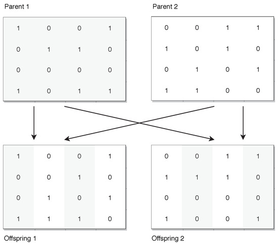 The purpose of the crossover operator is to exploit the search space regions near promissory solutions. Our proposed crossover operator is similar to the principle of uniform recombination. For each j column, the crossover algorithm selects one parent randomly out of two possible parents. The selected parent copies its j column in the first offspring, and the non-selected parent copies its jth column to the second offspring. The crossover is graphically shown below (Figure 1).
