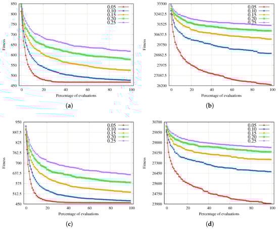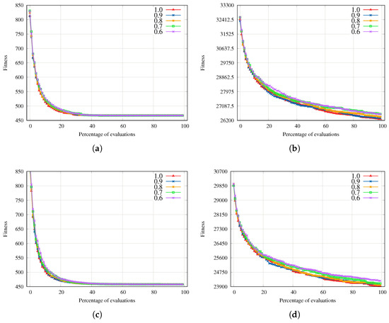 To analyze the parameter sensitivity behavior of the proposed EAs, we perform a parameter analysis using as a reference the best parameter setting (, ). We graphically analyze the median fitness evolution (on 100 independent runs) for all configurations. First, we analyze the crossover rate sensitivity, using parameters in Figure 5 for the GA. Here, we can see that the GA’s sensitivity to the crossover rate is low. For the instances Small and Small, all configurations converge, and for the instances Large and Large, the final performances differ. Clearly, the best crossover rate for the GA is in Figure 5.