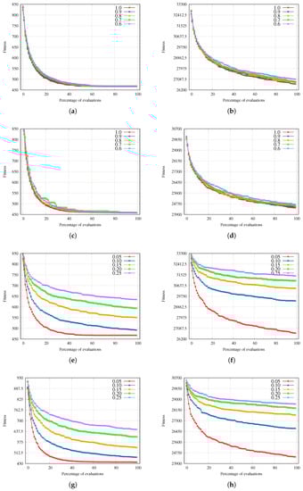 Crossover and mutation rates fitness evolution for the CGA. (a) Instance Small crossover rates. (b) Instance Large crossover rates. (c) Instance Small crossover rates. (d) Instance Large crossover rates. (e) Instance Small mutation rates. (f) Instance Large mutation rates. (g) Instance Small mutation rates. (h) Instance Large mutation rates.