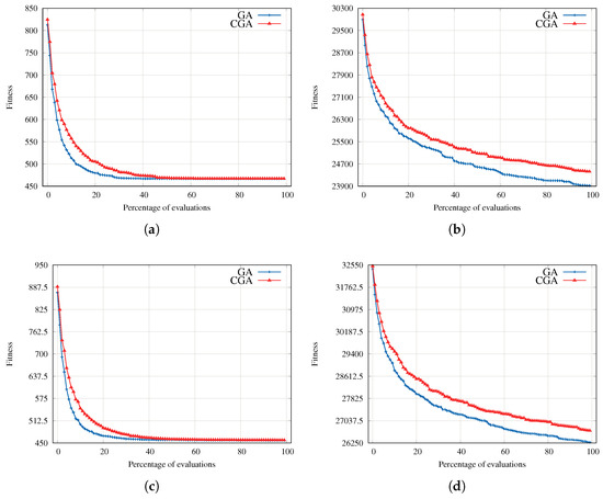 Comparison of the fitness evolution of the GA and CGA for some representative instances. (a) Instance 1 from the small set (Small). (b) Instance 5 from the large set (Large). (c) Instance 2 from the small set (Small). (d) Instance 1 from the large set (Large).