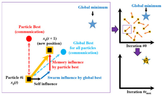 The basic PSO algorithm was suggested by Kennedy and Eberhart [20], as shown in Figure 1. As seen in a schematic of the basic PSO algorithm, an unplanned distributed population of potential solutions is initially generated in the algorithm, named particle i, where the subscript i = 1, 2, …, Np indicates the number of particles of a swarm or population, and each particle has multivariables j = 1, 2, …, Nv. The present position in the search space, i.e., xij, can move until the calculation stops at a predefined maximum iteration tmax. When a particle seeks the global best position within the swarm, the remaining particles will follow it. During iterations, every particle of the swarm searches for its own best experience and updates to particle best (Pbest). Then, the particle communicates the latest global best (Gbest) information for all particles and moves to a new position. The velocity vector of individual particles vij(t + 1) is generated, and then, xij(t + 1) is updated as below [15,20,21]: