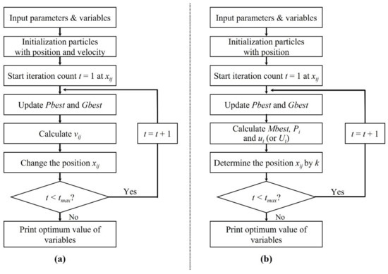 Flowcharts of PSO-based algorithms. (a) Basic PSO; (b) QPSO or GQPSO.