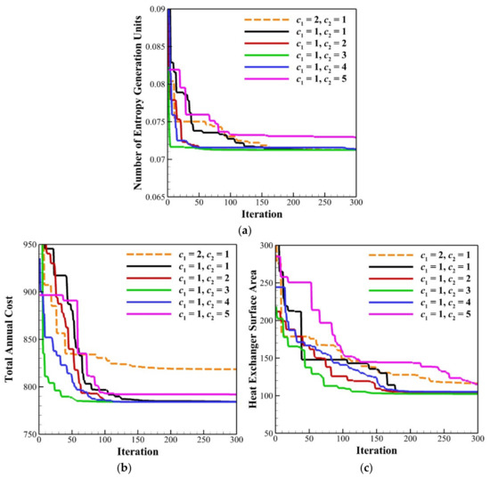 Converging influence of c2 on improved GQPSO for different objective functions. (a) Number of entropy generation units (NEGUs); (b) total annual cost (TAC); (c) heat exchanger surface area (A).