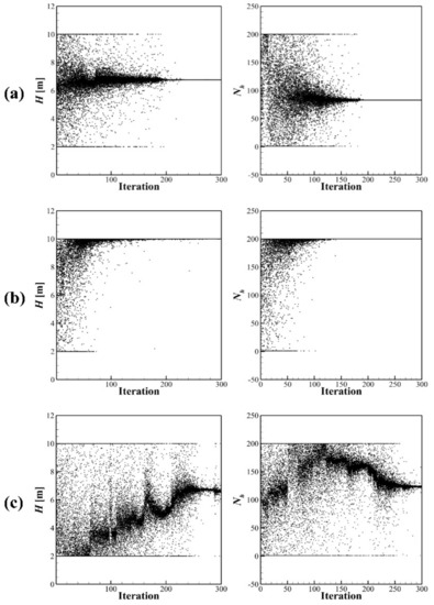 where q is a positive constant, such as 100,000 in this study. As defined in Equation (12), the minimum objective function values of the particles existing within the feasible calculation region (Ω) are considered to be possible candidates for global optimal solutions (Gbest), while the minimum objective function values of other particles that violate the given constraints are multiplied by an arbitrary large constant (q) to be excluded as possible candidates for Gbest. As a result, proper values of Gbest can be attained only among the feasible particles. Although a value of 5000 for q has been suggested in a previous study [18], a much higher number (100,000) was chosen to definitely exclude the particles beyond the given constraint region.