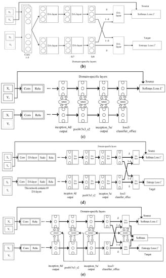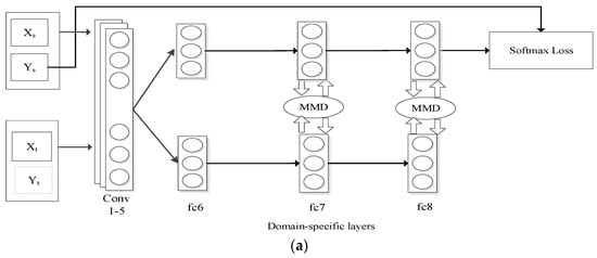 Recently, research based on deep learning has achieved remarkable results in different fields [12,13,14,15]. In most studies, the discrepancy between the source domain and target domain is reduced by learning the domain-invariant features, usually mainly using two main strategies. One strategy is based on minimizing the domain adaptation loss, which contains hyperparameters for a regular term, such as the minimization of the maximum mean discrepancy (MMD) [16,17,18] or the domain-confusion loss [19,20]. The common purpose of this strategy is to obtain more domain-invariant representations. We call this method the parametric approach.