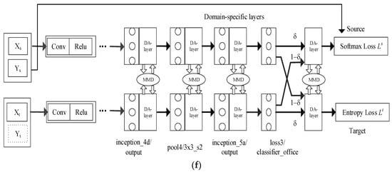 Domain-based automatic alignment and moment matching can also be applied to deeper network structures, such as ResNet [33], VGGNet [34], or GoogLeNet [32]. The total loss function of the structure is determined according to Formula (9):