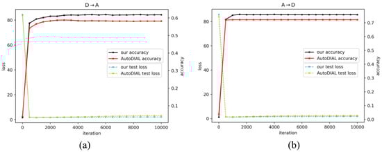 Comparison with the AutoDial method: (a) accuracy and test loss for task D→A; (b) accuracy and test loss for task A→D.