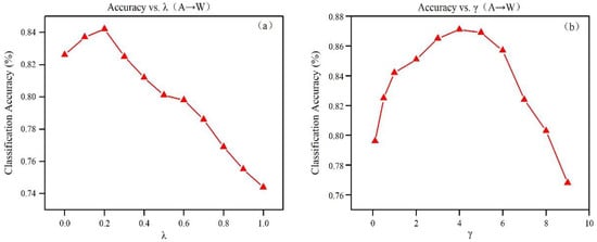 Sensitivity of parameters λ and γ: (a) accuracy vs. λ; (b) accuracy vs. γ.
