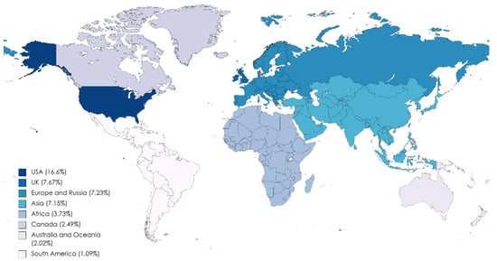 Geographical representation of Twitter activity in period 1 (Source: Own data, created with mapchart.net (accessed on 4 April 2022)).