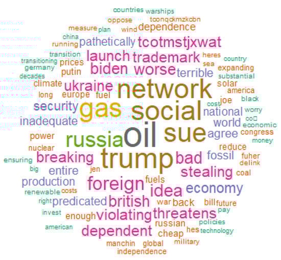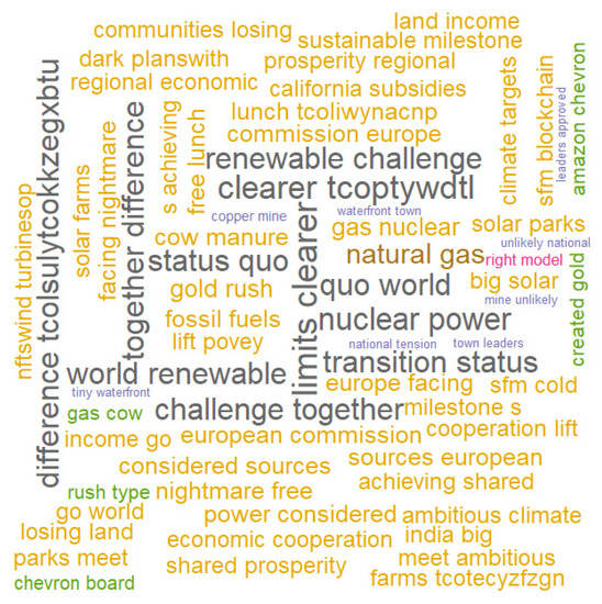 Looking at the 100 most common word bigrams, this change in the content of social discourse could also be observed. Before 22 February (see Figure 6), the discourse focused on issues directly related to energy with bigrams such as world renewable, transition status, renewable challenge, and others in a similar sense. After 22 February (see Figure 7), the 2022 Ukrainian–Russo conflict crept into the discourse and it became more economic and political, showing the concern of society for the reality that was being experienced. Thus, bigrams such as social network, Trump social, bad, worse, threatens sue, stealing sue, violating trademark, and terrible idea appear in the debate. There are also other bigrams reflecting how the 2022 Ukrainian–Russo conflict has posed a threat to international agreements and Russia’s energy dependence as pathetically dependent, economy inadequate, or dependent foreign. None of the most repeated bigrams no longer referred to purely energy issues or were directly related to green or renewable energy. This shows how the mood of the population concerned about green energy changed in relation to the outbreak of the conflict.