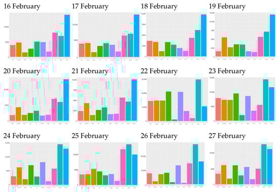 Figure 10 displays a daily sentiment analysis with samples of 10,000 tweets per day. No differences in sentiments or emotions were observed on all days of period 1. On 22 February there was a very significant change in the trend as negative sentiments were nearly triple the positive ones. From 22 February until 27 February, negative sentiments continued to be higher than positive ones, remaining at very high levels until the end of period 2. This change also affected the emotions most related to negative sentiments, such as anger, disgust, fear, and sadness. Regarding the emotions related to the positive sentiments, the decrease in joy stands out.