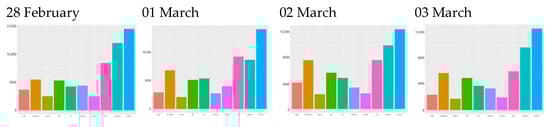 From February 25 onwards, bad news began to arrive from Ukraine, and the exodus of Ukrainians to bordering countries began. Among the emotions observed on that day, a significant increase in trust stands out. It should not be forgotten that we are analyzing the social listening on green energy. The conflict highlighted the issue of energy dependence, especially from Europe but also from other parts of the world, on a country like Russia, which the political elites say they “cannot trust”. This makes it necessary to look for other sources of energy and to move towards cleaner, renewable, and more efficient energies, which is why trust values were so high. These high trust values may also be driven by the U.S. Department of Energy’s (DOE) announcement of a comprehensive strategy to secure the U.S. clean energy supply chain (Available online: https://www.energy.gov/articles/doe-releases-first-ever-comprehensive-strategy-secure-americas-clean-energy-supply-chain (accessed on 30 March 2022)).