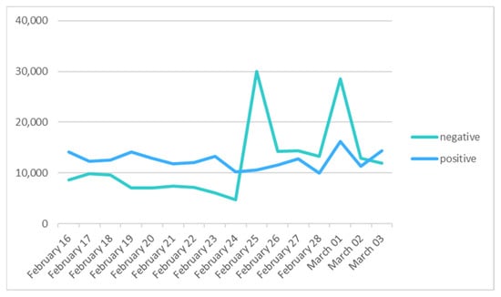 February 23 could be considered a transition day; positive feelings recovered to their previous levels, but negative feelings did not fall. As for emotions, only a slight increase in trust and joy stands out. This was possibly because even though it was known that a 2022 Ukrainian–Russo conflict would be imminent, it had not yet begun.