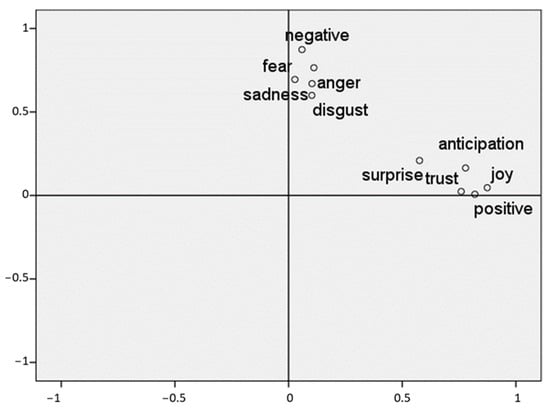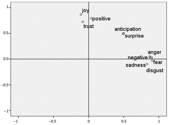 As expected, after optimizing the explainability of the factors extracted from a Varimax rotation, positive sentiment as well as the emotions of anticipation, joy, surprise, and trust were present in the first factor. Negative sentiment along with the remainder of the emotions formed the second factor. The relationship between these factors is shown in Figure 15.