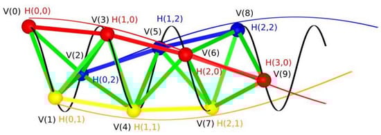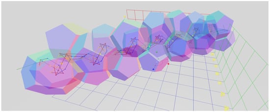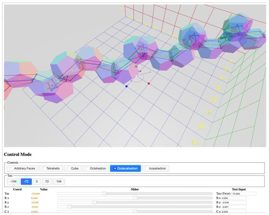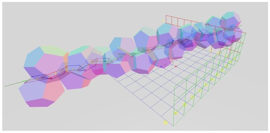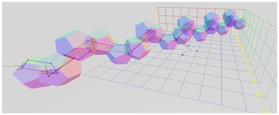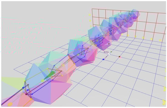 The Boerdijk–Coxeter tetrahelix (BC helix) (see Figure 10) is a periodic chain of conjoined regular tetrahedra which has been much studied [,,,] and happens to have irrational measures, making it an ideal test case for these algorithms. Because the face-normals can be calculated and the positions of the elements of the BC helix directly calculated, we can use it to test the algorithms, and in fact these algorithms give the same rotation.