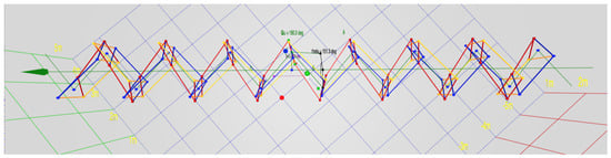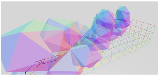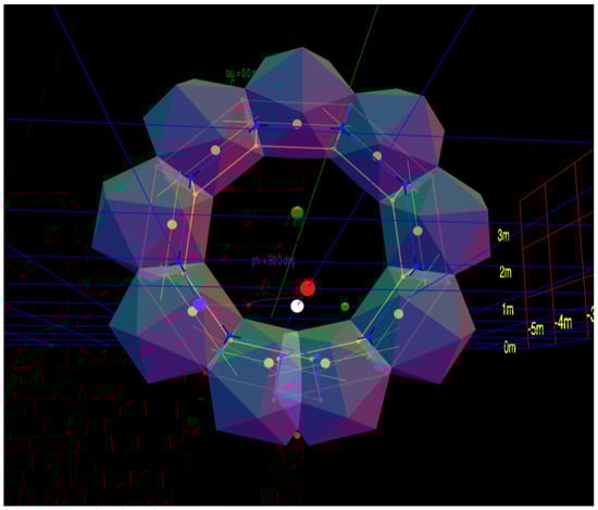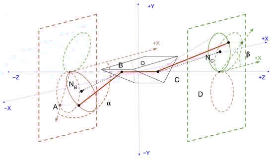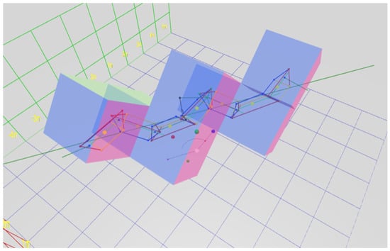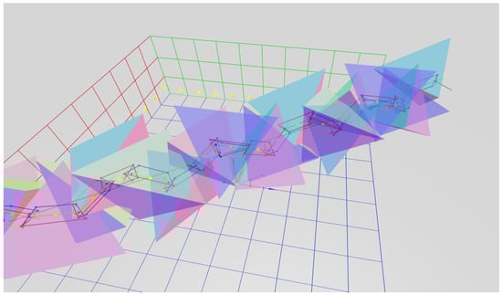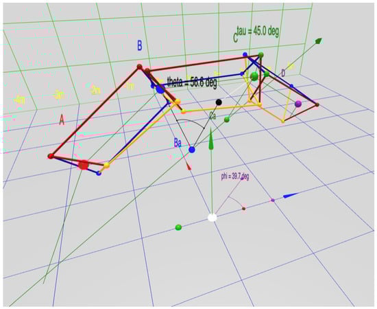 In Figure 3, and the website, we represent the object as a prism with a triangular cross-section, because this is the simplest physically realizable macroscopic object that supports a face-to-face connection. In this diagram, the points , and D are represented by the sphere of the same color as the label. The view is roughly in the direction of the axis of the segmented helix, which is drawn as a dark green arrow, pointing in the positive z and positive x direction, parallel to the -plane. For ease of viewing, the entire segmented helix has been raised by two units on the y axis. The segment has coordinate , is aligned with the z-axis, and is centered in the z direction.
