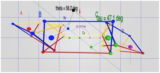 However, it should be cautioned that the helix which Coxeter identified [] goes through every node of every tetrahedron. Constructing the helix going through only “rail” nodes allows irregular tetrahelices to be designed [] (see Figure 11). However, the segmented helices defined in this paper do neither; rather, it is most natural to imagine them moving through the centroid of a face of a tetrahedron. This is a segmented helix of very small radius () compared to the other two approaches () which measure the radius to the vertex of the tetrahedron, but it has the advantage that it is far more general. For example, it is clearly defined if one used truncated tetrahedra. The rotation of a segment matches the BC helix analytical solution () (see first line of Table 1), because a screw transformation does not depend on selecting a point for the radius.
