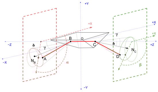 Take an object A with axis . By Chasles’ theorem [] there is a screw axis , a set of rotations, and a transposition d which moves the first object to the position where the second object B with axis is. Take one of the rotation angles of smallest value. Construct the points , and as the closest points to and C on this screw axis. These points are collinear by construction.