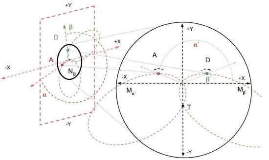 If , then form an isosceles triangle in the direction of the second object, whose axis is . Form this triangle so that one edge is a bisector of the angle between the axes , as illustrated in Figure 2. Make .